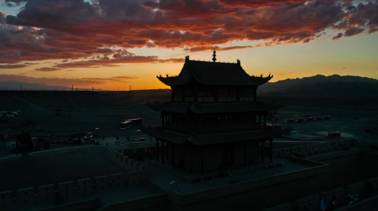 8月16日拍摄的火烧云与嘉峪关关城(无人机照片)。新华社记者 郎兵兵 摄