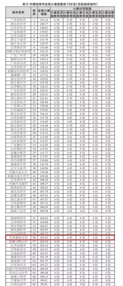 中国全面小康指数约为97.00,甘肃嘉峪关市为102.65
