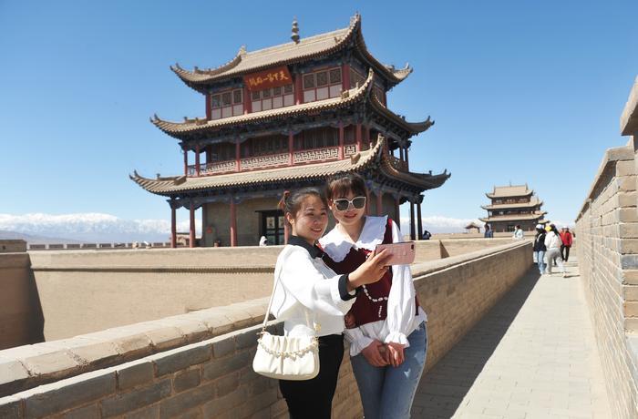 图①:今年五一期间,我市所有景点在严格执行疫情防控措施的同时向游客开放。图为5月2日,游客在嘉峪关关城游玩,享受假日快乐。嘉峪关日报全媒体记者 高深摄