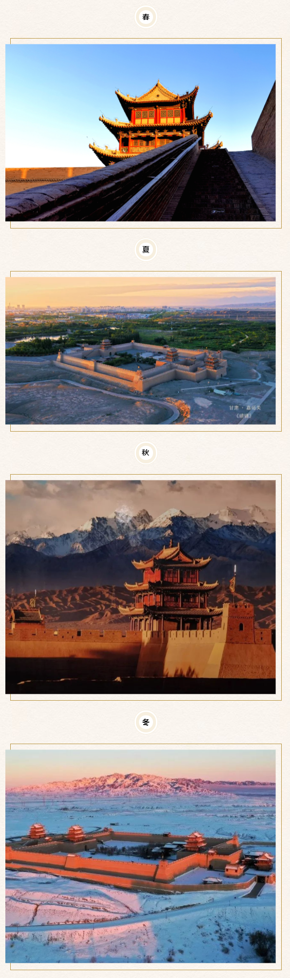 春夏秋冬,四季轮回,是大自然赐予人间最美丽的景色。关城之景也在时光变换中升华。春天繁盛,夏天葱笼,秋天斑斓,冬天纯净,各有美感,魅力无穷。关城之景,绚丽四季。