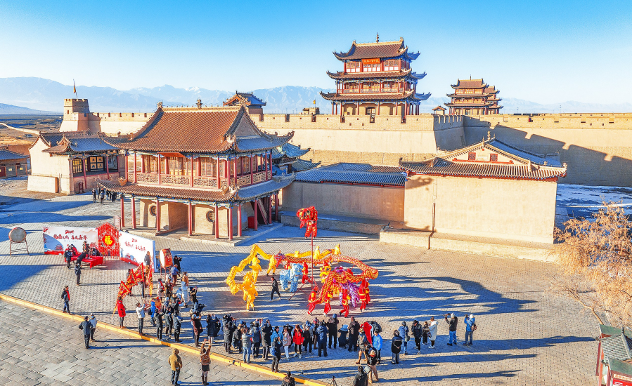 1月1日,嘉峪关关城景区举办“福启关城 喜庆嘉年”元旦祈福活动,为新年首日“入关”游客送上舞龙舞狮表演、精致“祈福牌”,并免费签发“关照”。 这是舞龙舞狮表演现场。融媒体中心记者 李巍 摄
