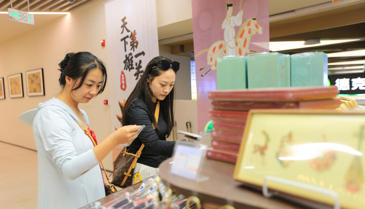 8月2日,嘉峪关市关城景区迎来暑期旅游高峰,来自全国各地的游客在关城景区游客服务中心选购具有地域特色的文旅文创产品。