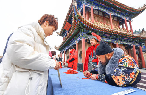 “雄关迎瑞 欢度新春”。春节假期,嘉峪关关城景区组织开展寻宝探秘、关长赐福等多项互动活动,在欢声笑语中为游客送上新春祝福。