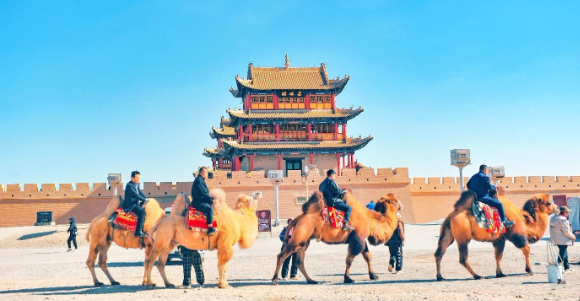 Recently, tourists enjoyed camel rides at the Jiayuguan Pass scenic area.