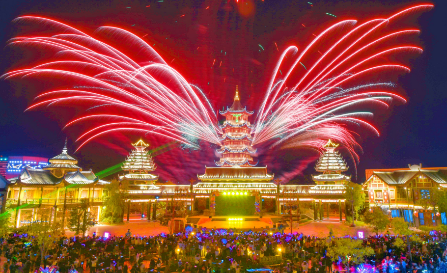国庆黄金周期间,方特丝路神画举办6场国庆夜场活动,天幕烟花秀、光影无人机、丝路华裳节等精彩活动同步启动,在弥漫全场的欢乐氛围中,与来自五湖四海的游客一同为祖国献上祝福。 这是丝路神画天幕烟花秀表演现场。