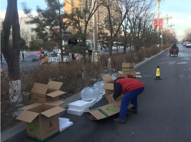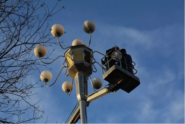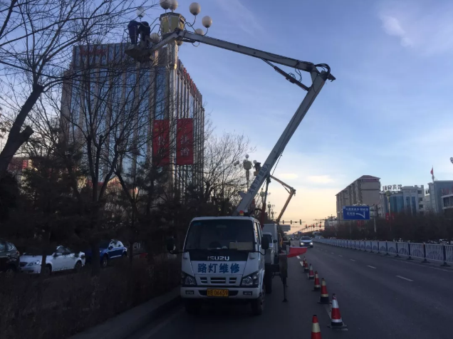 ▲冬日严寒,工人师傅正在进行高空作业,对路灯进行更换