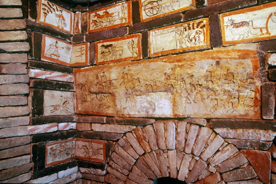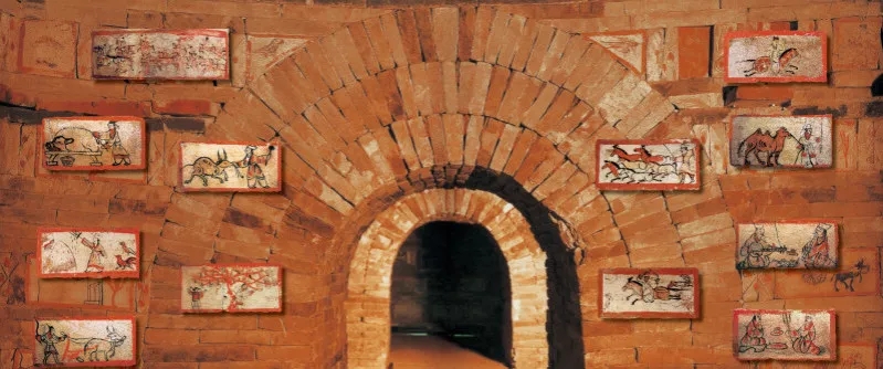 墓门上有雕云纹、水火图、四神像图或仙灵异兽等彩绘图案;地面铺以各式花纹砖;墓室四壁为表现劳动人民生产生活和墓主人奢侈豪华生活的砖画。