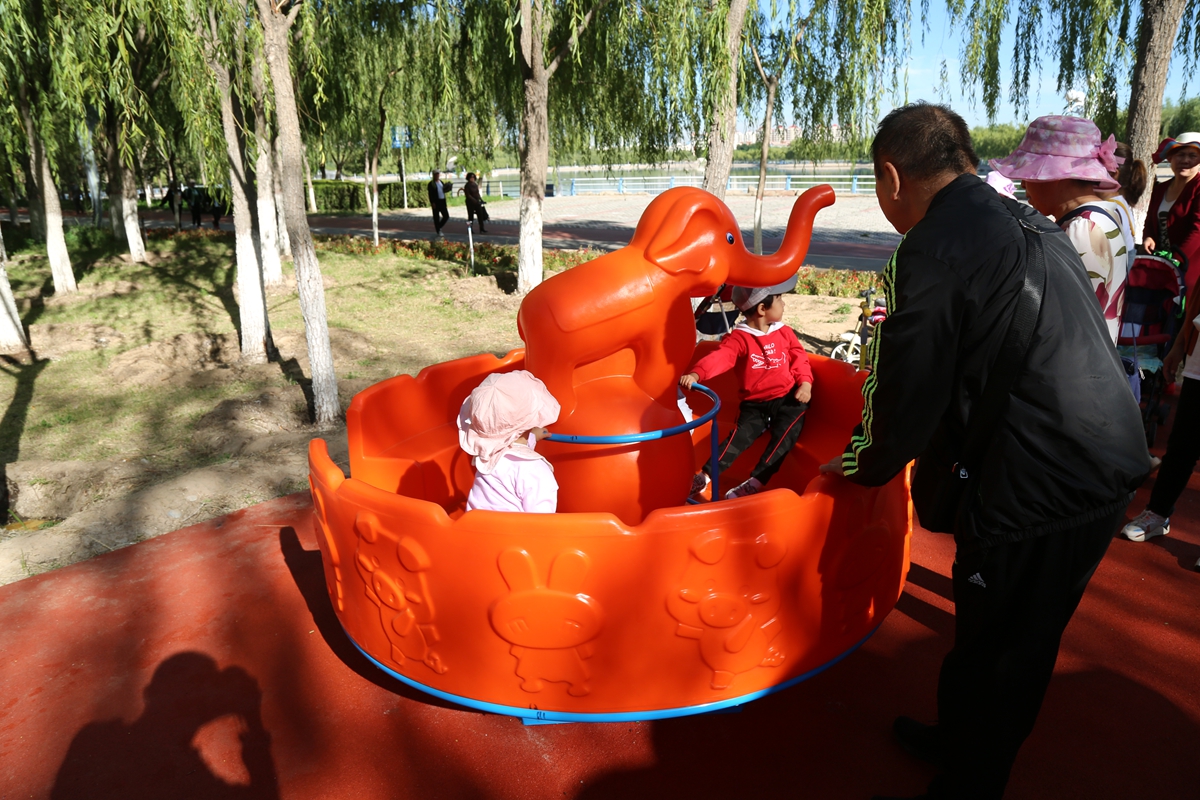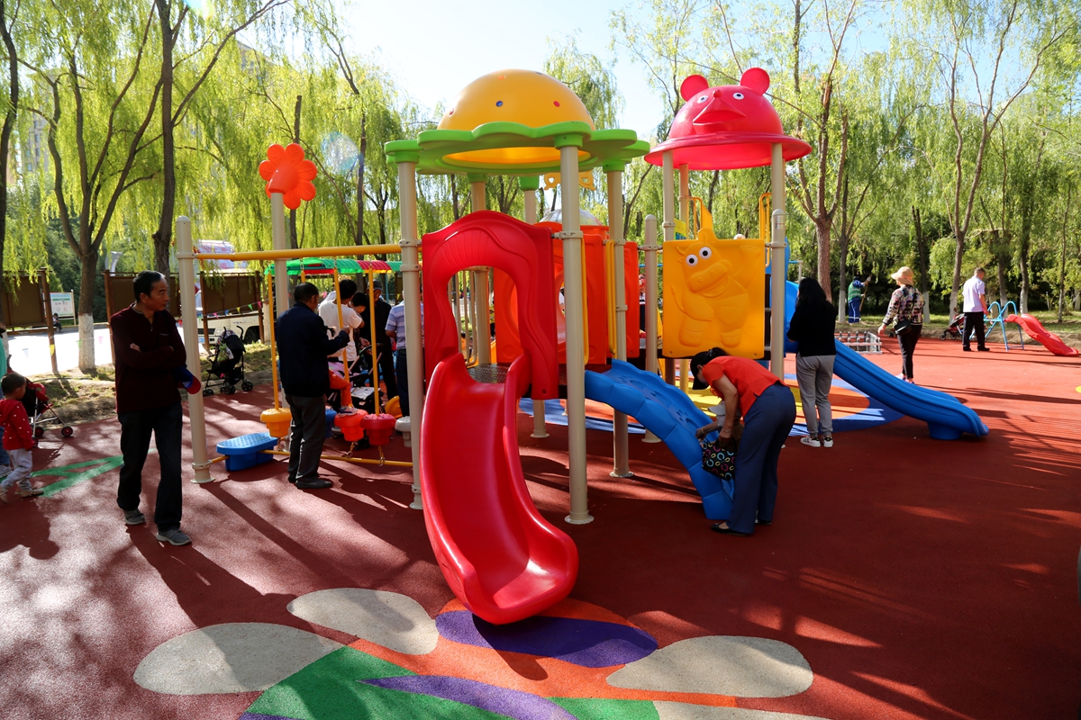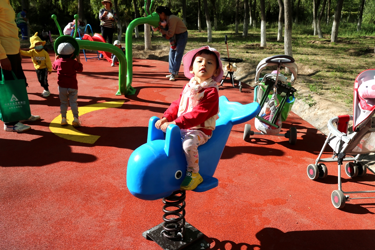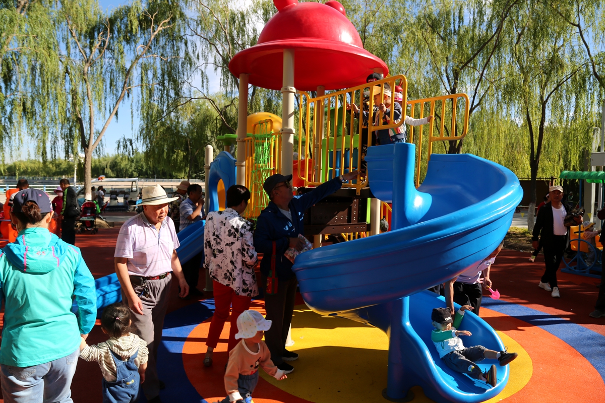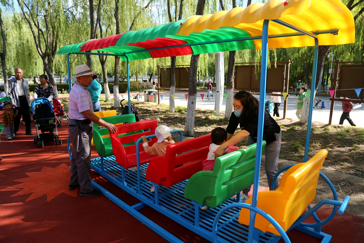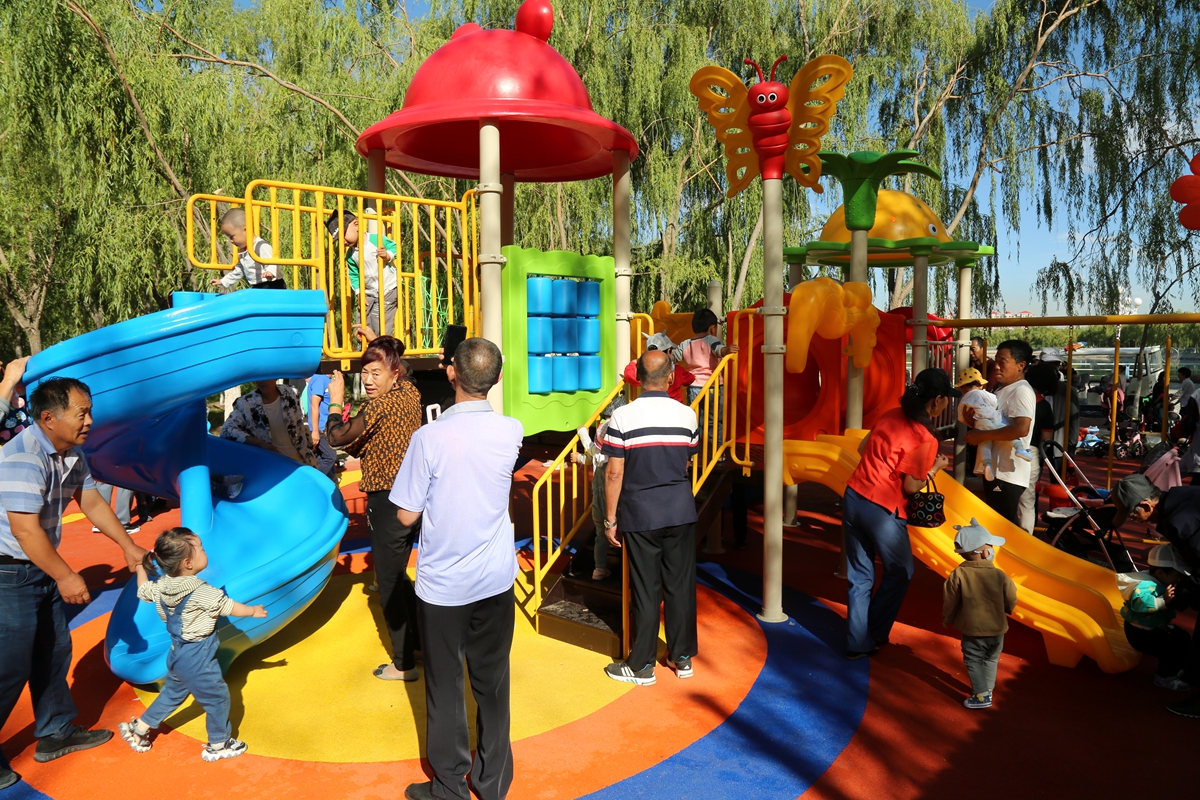 ▲不少家长带孩子在新增加的儿童游乐区域玩耍