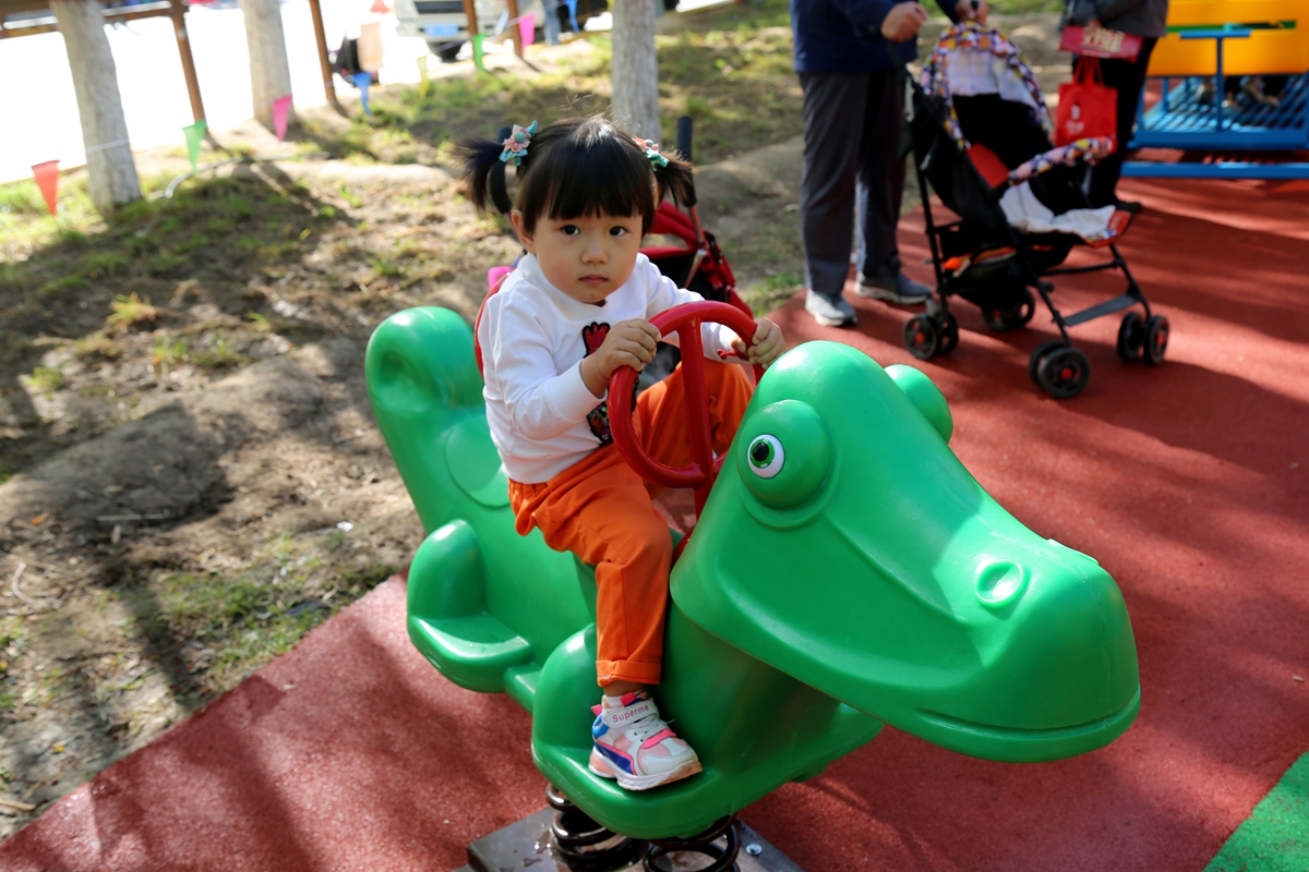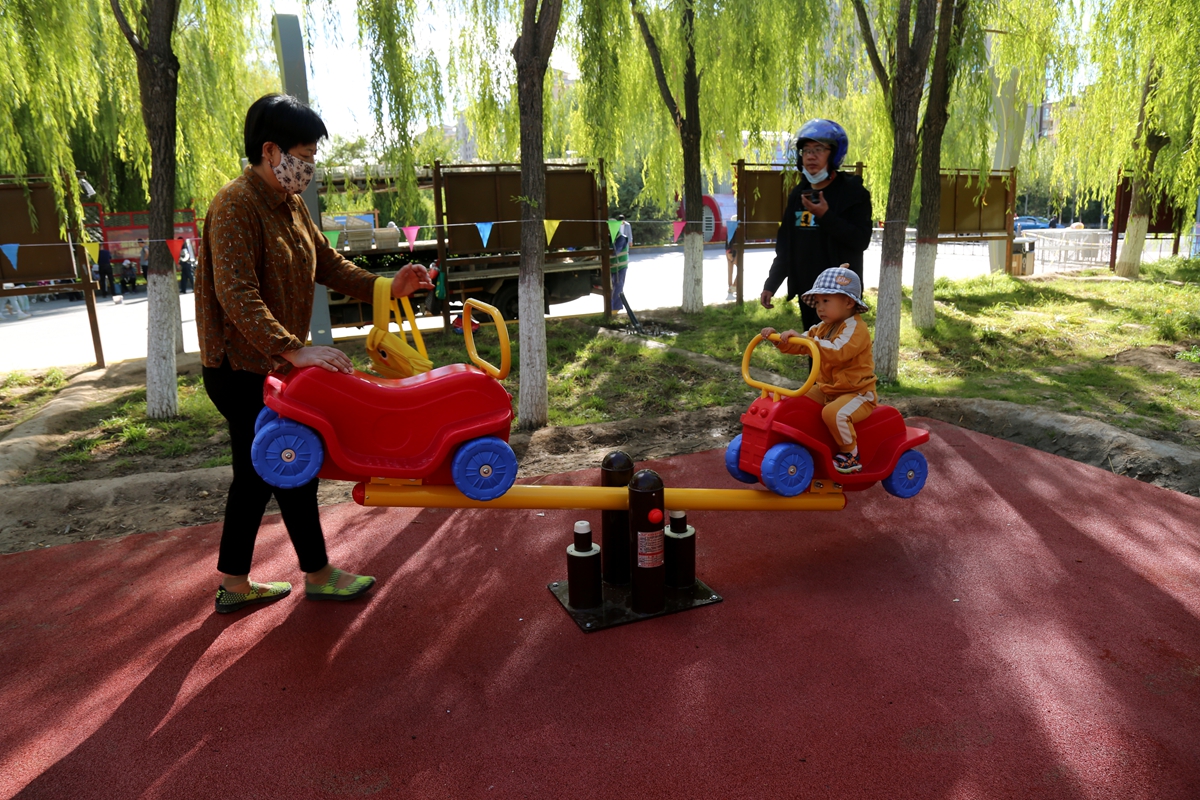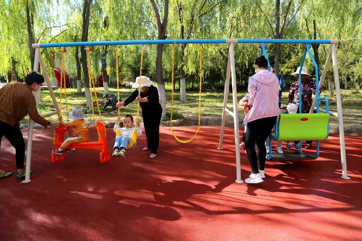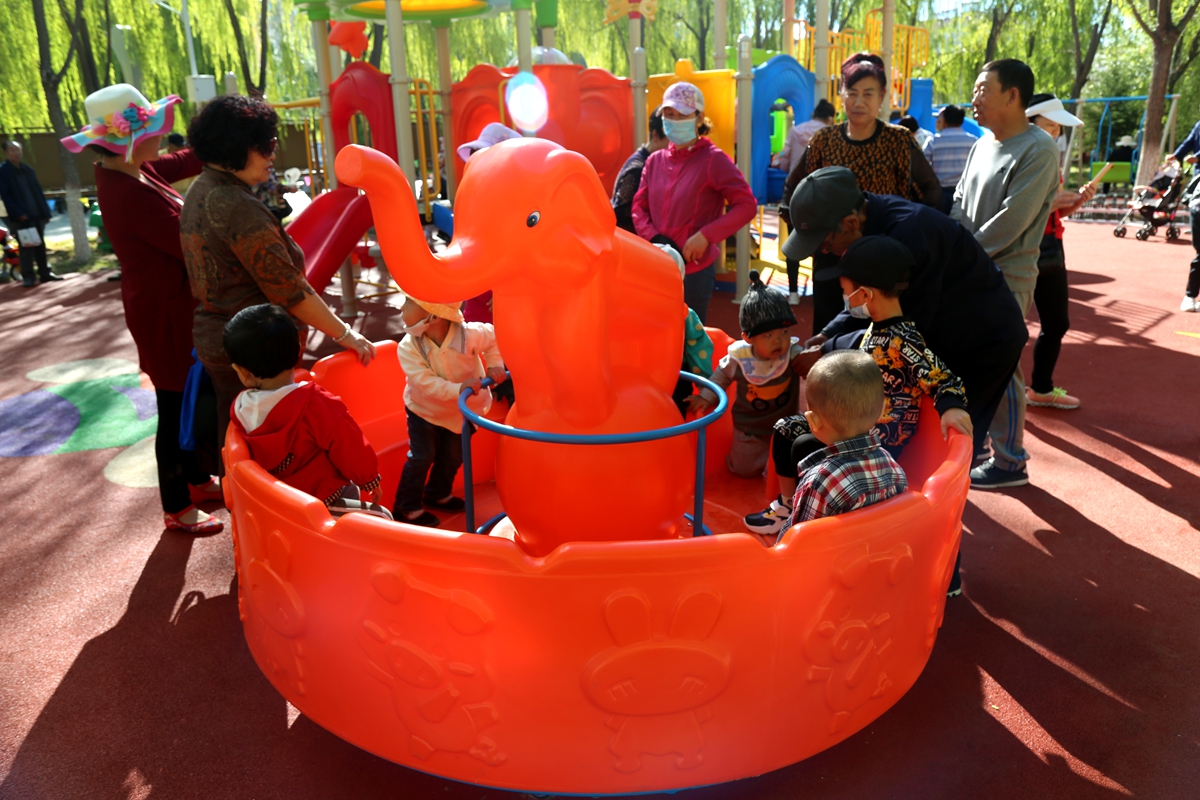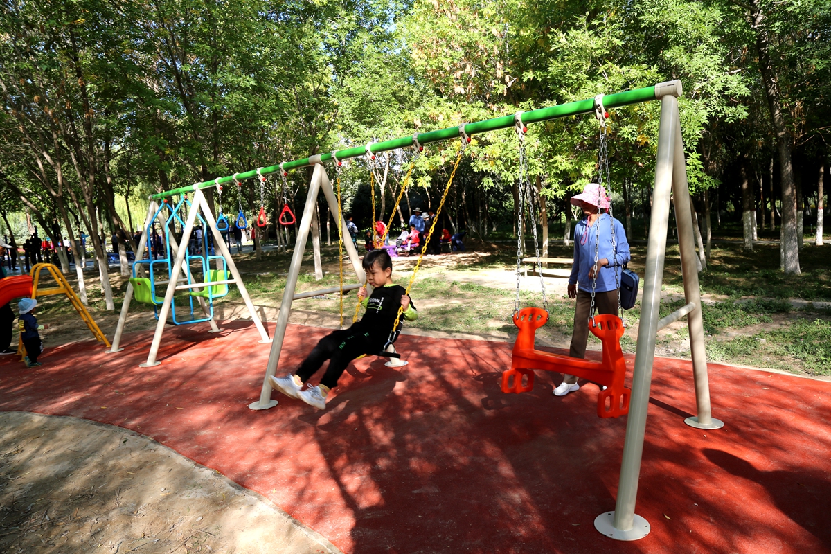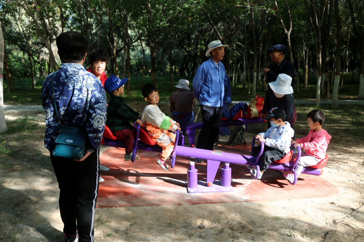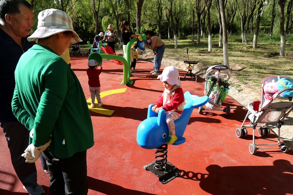 ▲不少家长带孩子在新增加的儿童游乐区域玩耍