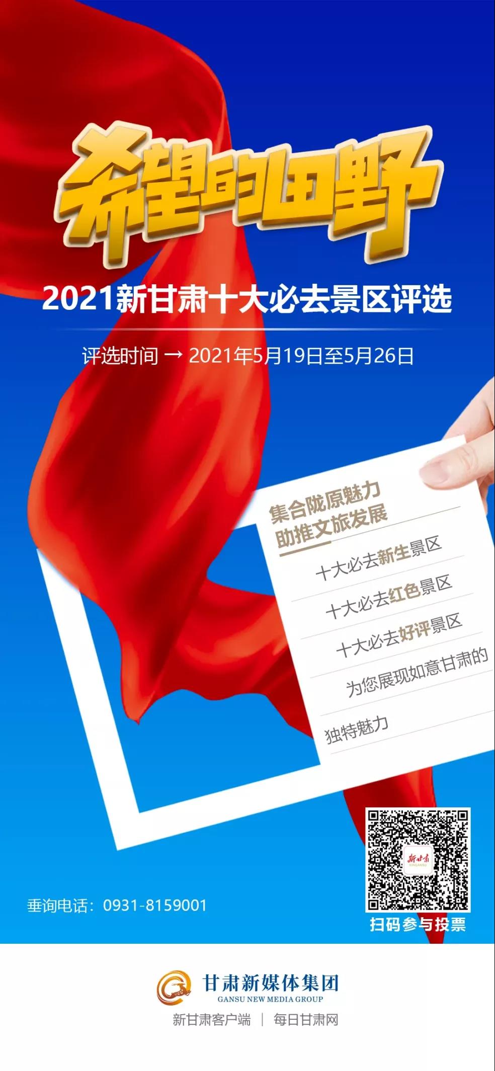 集合陇原魅力,助推文旅发展。为促进我省旅游景区高质量发展,着力提升旅游景区管理水平和服务质量,打造优质旅游景区品牌形象,发挥龙头旅游景区的示范带动作用,增强我省旅游景区的整体影响力和吸引力,树立甘肃旅游景区品牌形象,展示“交响丝路·如意甘肃”的独特魅力,甘肃新媒体集团推出“希望的田野——2021新甘肃十大必去景区评选”活动。经过征集筛选,全省各市州100个旅游景区参与此次评选,其中红色景区23家,好评景区43家,新生景区34家,最终将评出十大必去红色景区、十大必去新生景区和十大必去好评景区。