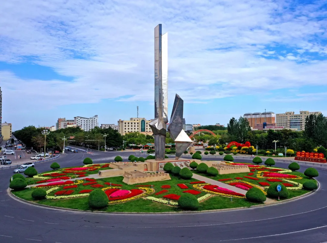 建成于2001年6月,地点在嘉峪关市雄关广场转盘中心。雕塑总高度39米,宽10米×7米。结构骨架内衬碳钢板,表面为2.5厘米厚的镜面不锈钢,总重量约60吨,雕塑由主体及长城造型基座两大部分组成,辅以魏晋墓壁画“农耕““出巡”图浮雕。涵嘉峪关为丝路文化和长城文化交汇之底蕴。形如长剑指天,寓亲手创造了戈壁钢城的嘉峪关人坚韧不拔,奋发向上,继续创建嘉峪关更加辉煌明天的美好愿望。