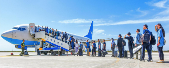 乘坐我市直飞北京大兴机场MF8212航班的旅客秩序登机 。