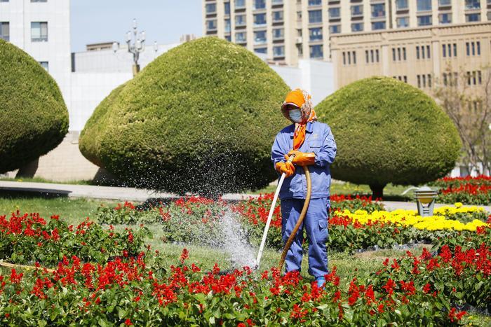 5月4日,嘉峪关恒禾园林科技有限公司绿化工人正在雄关广场花坛浇水养护花卉。