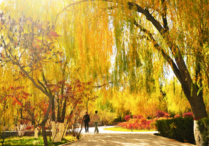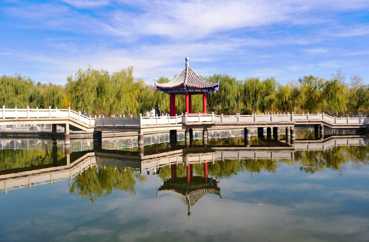 10月27日,迎宾湖旅游园区层林尽染,亭台楼阁、树木碧水相映成趣,构成了一幅幅美丽的秋日生态画卷,吸引市民前来赏景游玩。