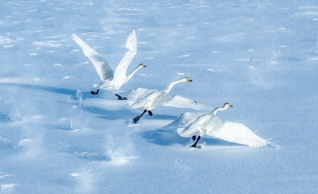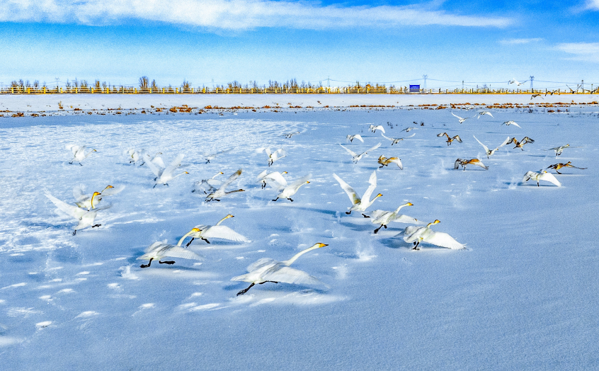 春节期间,栖居在草湖国家湿地公园的越冬大天鹅用轻歌曼舞迎接新春到来。