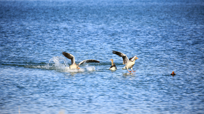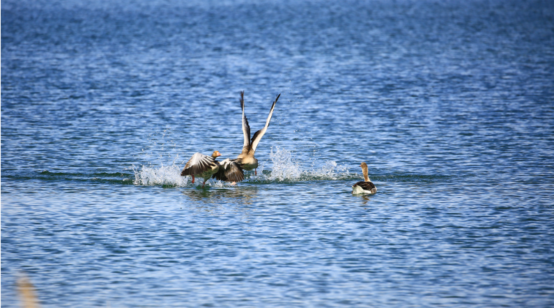 一时间,湖面热闹得如同盛大派对。赤麻鸭活泼好动,你追我赶,激起串串晶莹水花;灰雁迈着优雅步调,在水中悠悠游弋,不慌不忙寻觅食物;绿头鸭三五成群,时而一头扎进水里,时而冒出头来,抖落水珠;白鹭展开宽大洁白的双翅,在空中划出优美弧线,偶尔俯冲贴近水面,轻点一下又迅速飞起;白骨鸡在浅滩处东奔西走,机灵地翻找着可口小食。