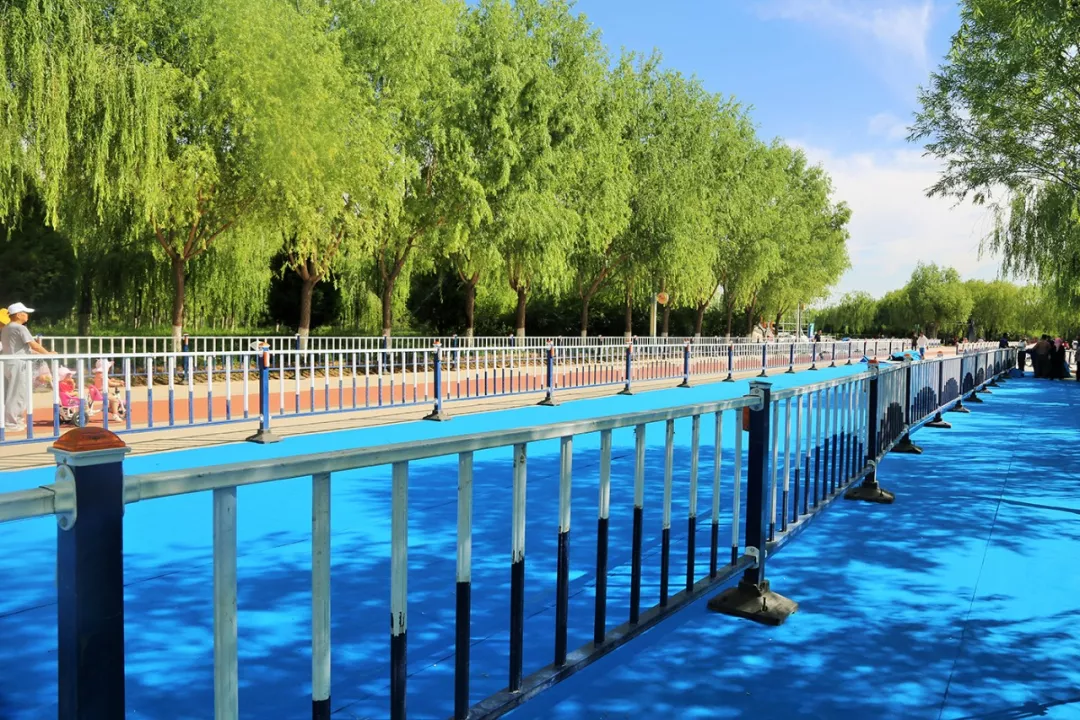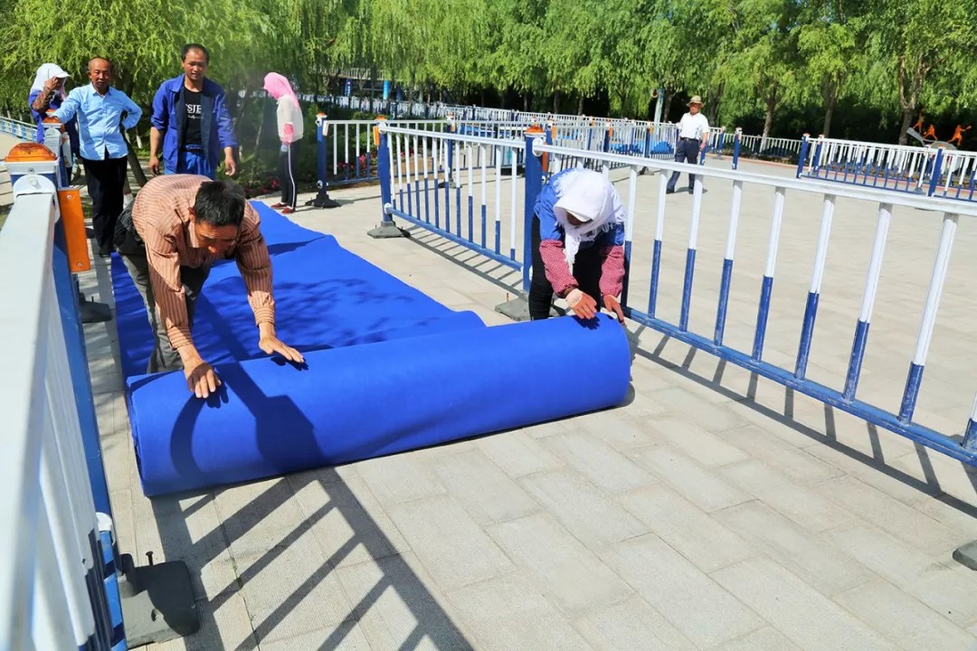 比赛主会场的地上开始铺上了蓝色的地毯,大海一般的亮丽颜色,让主会场充满了拼搏的色彩。