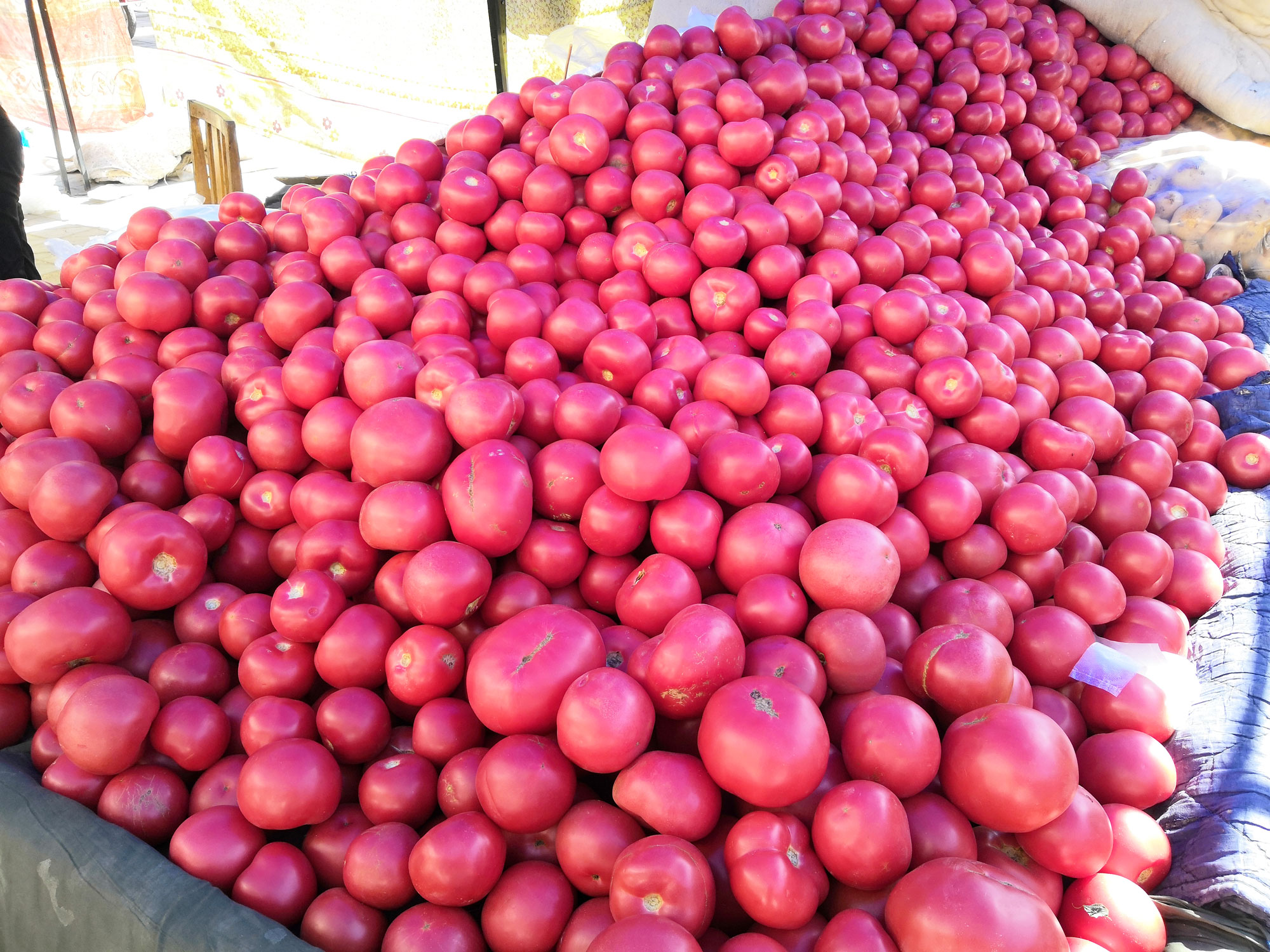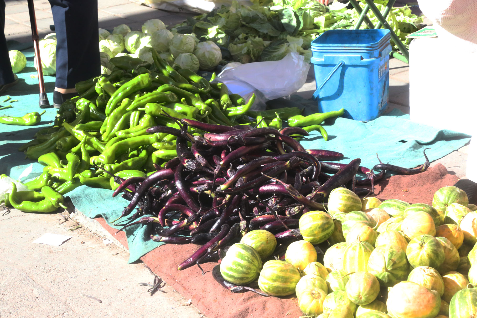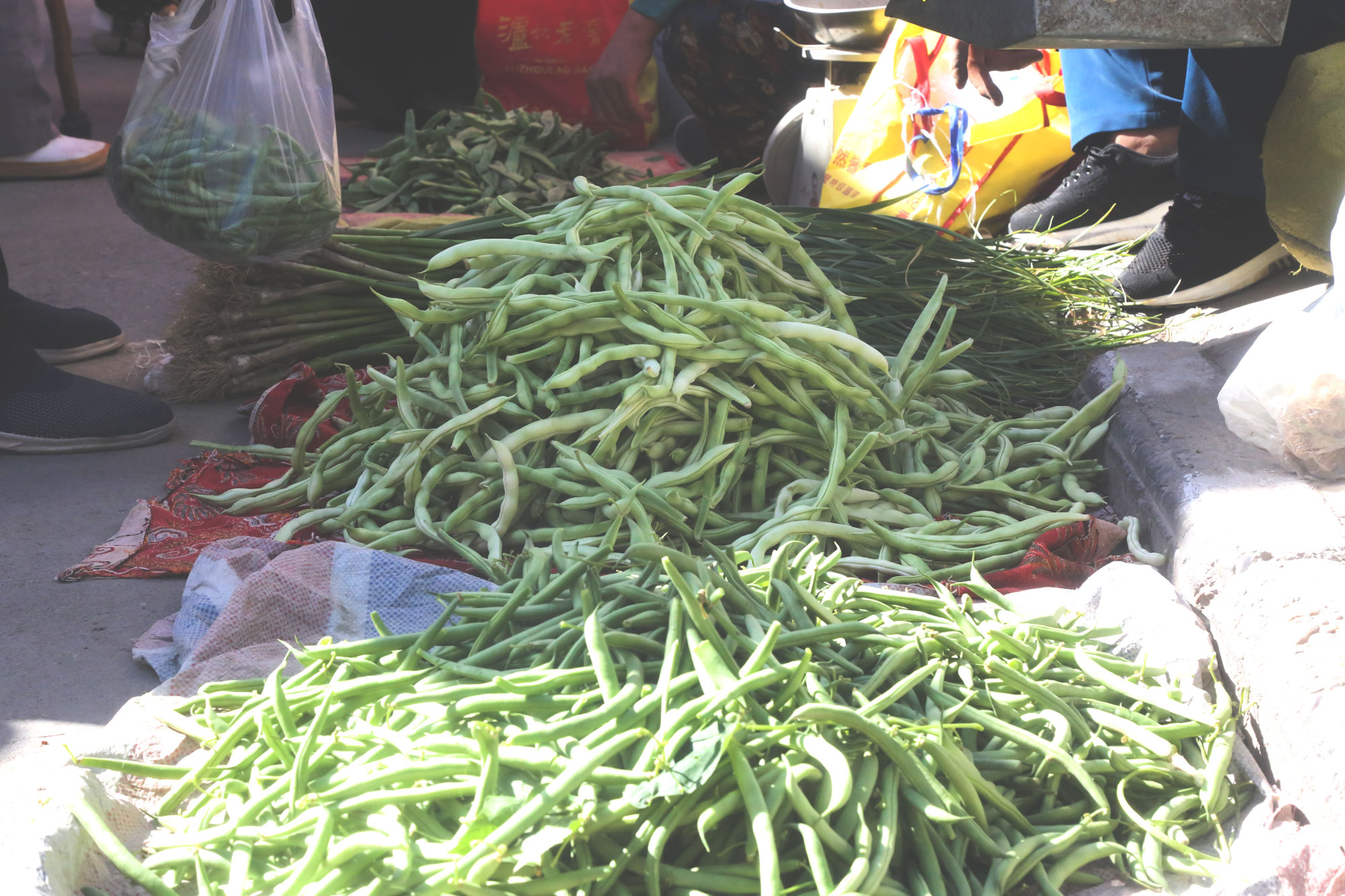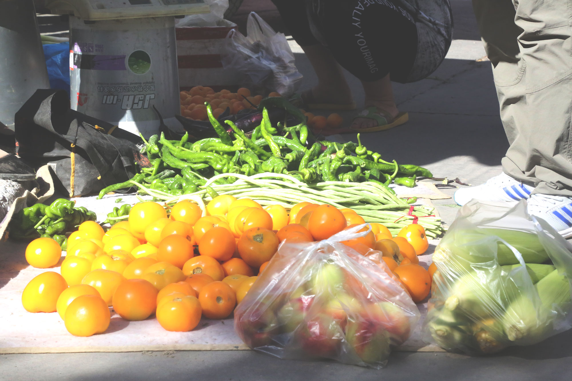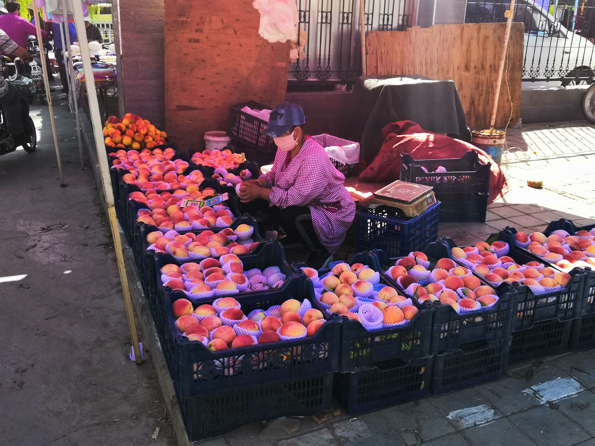 水果蔬菜等都很新鲜,很多是近郊村民自产自销,还有一些贩运果蔬的零售商贩。这些摊位在道路两侧一溜排开。