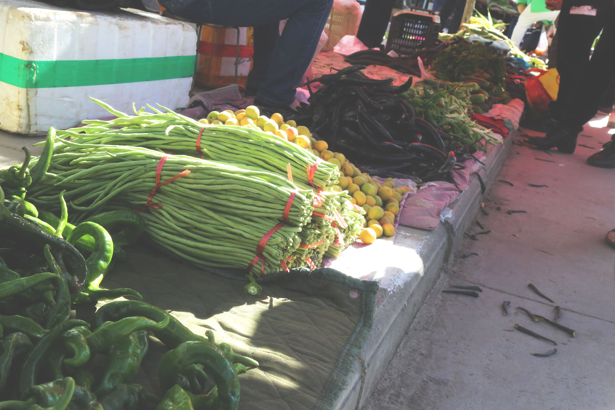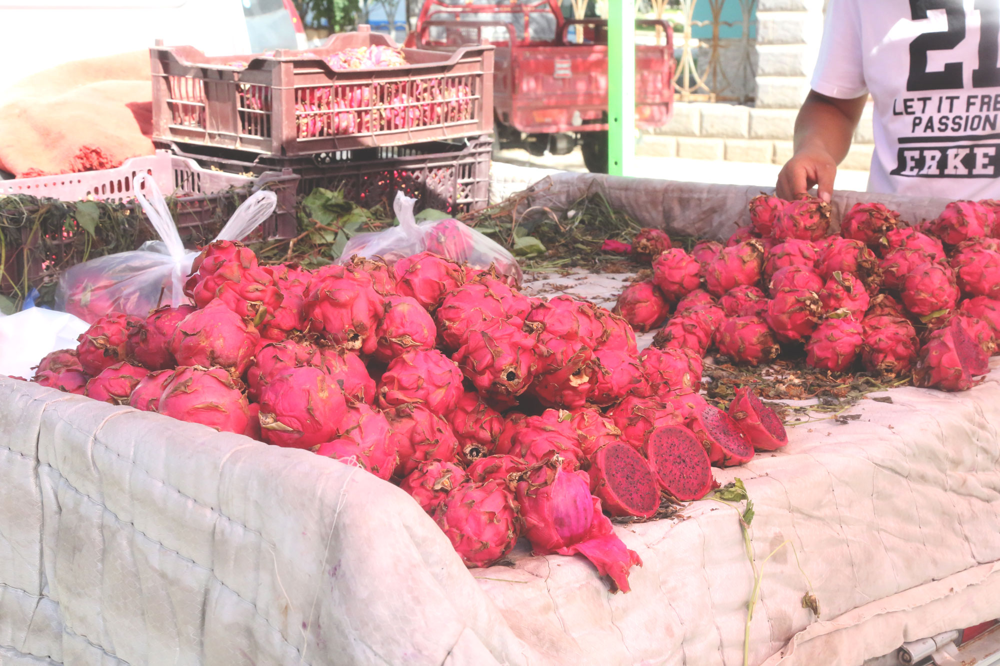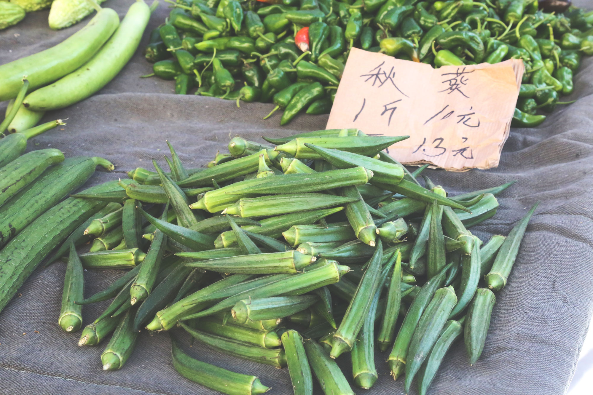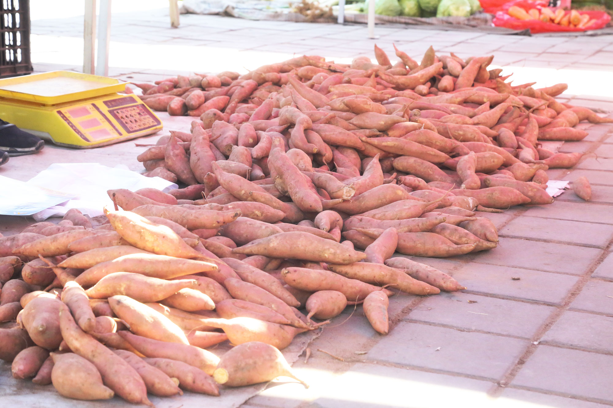 水果蔬菜等都很新鲜,很多是近郊村民自产自销,还有一些贩运果蔬的零售商贩。这些摊位在道路两侧一溜排开。