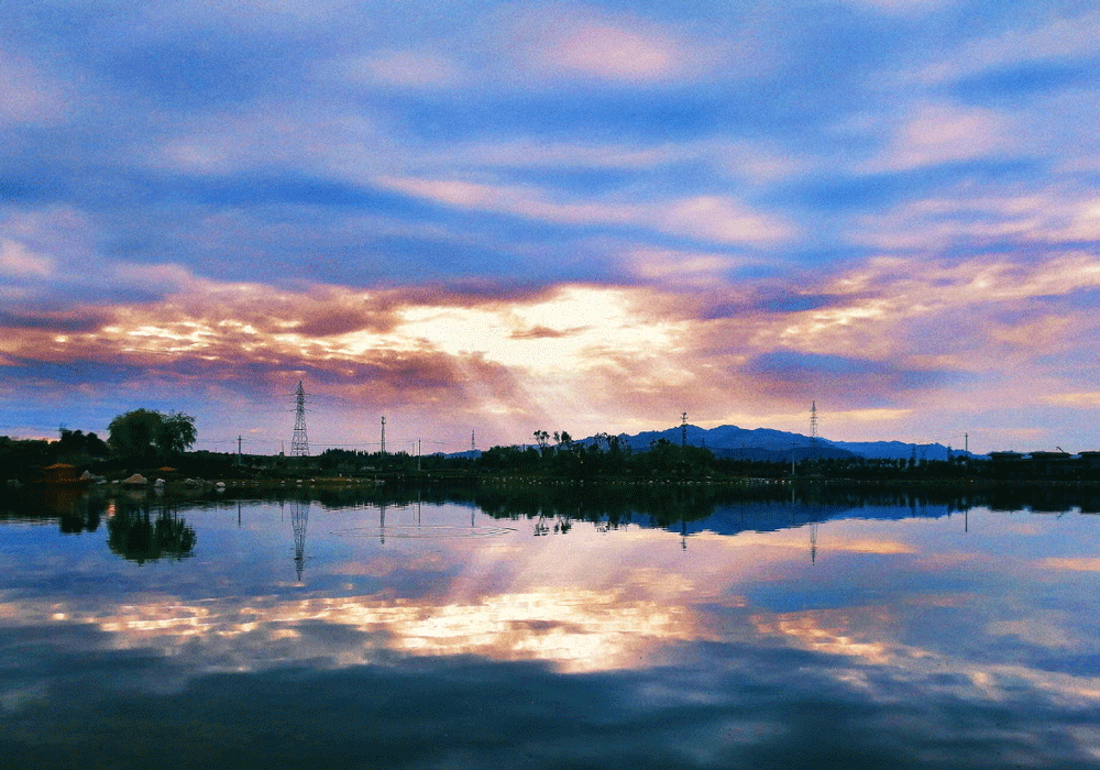 在渐渐落下的夕阳,湖愈显得越来越宁静,可谓“波澜不惊”;白云更是显得浓融、纯净,夕阳慢慢地与湖与天与云融为一体,湖面面变成了天空的镜子,随着天空慢慢暗淡,嘉峪关也慢慢入了夜色。