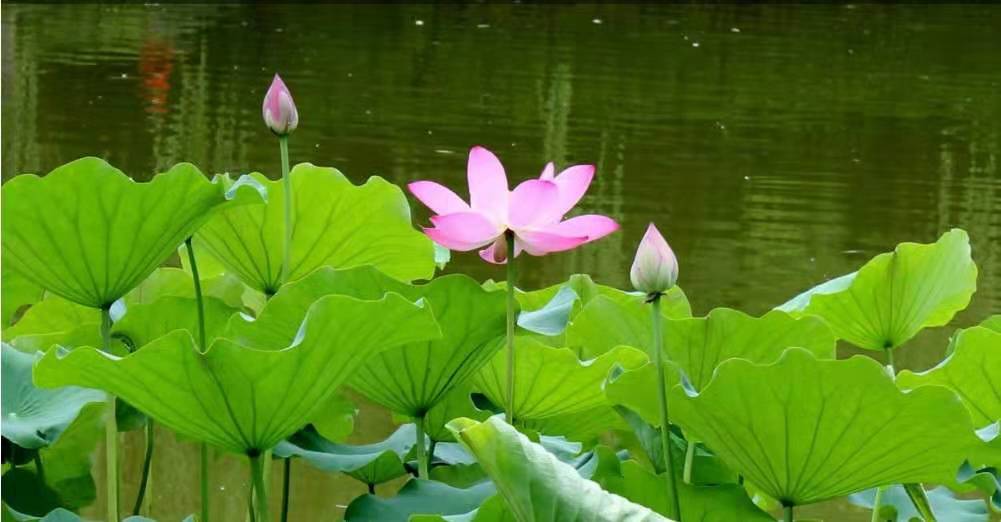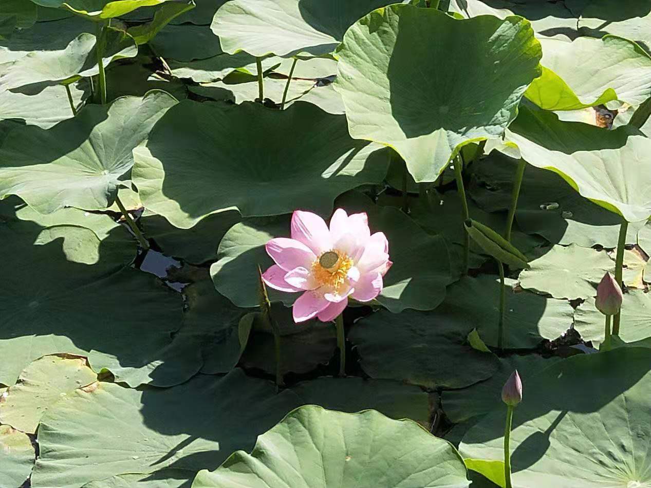 走在雄关公园的荷花池旁,朵朵睡莲在水里绽放,紧紧依偎着碧绿滚圆的荷叶,在耀眼的阳光下,显得更加清秀雅洁。