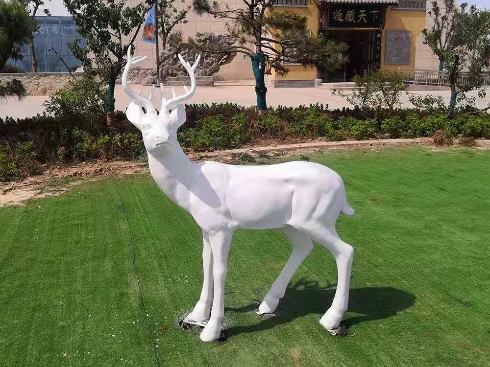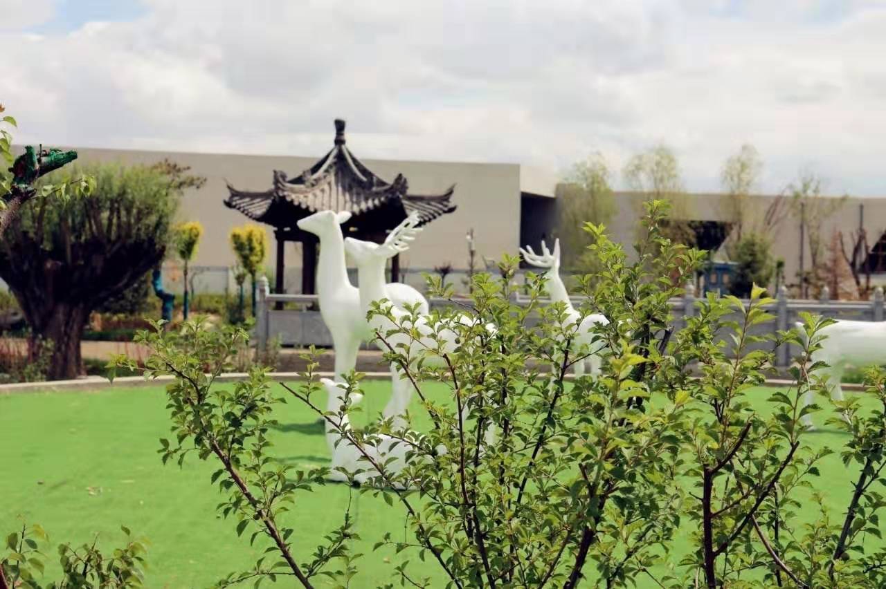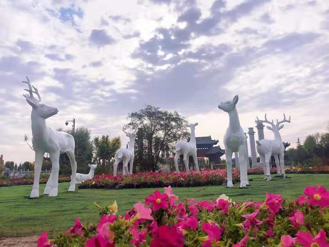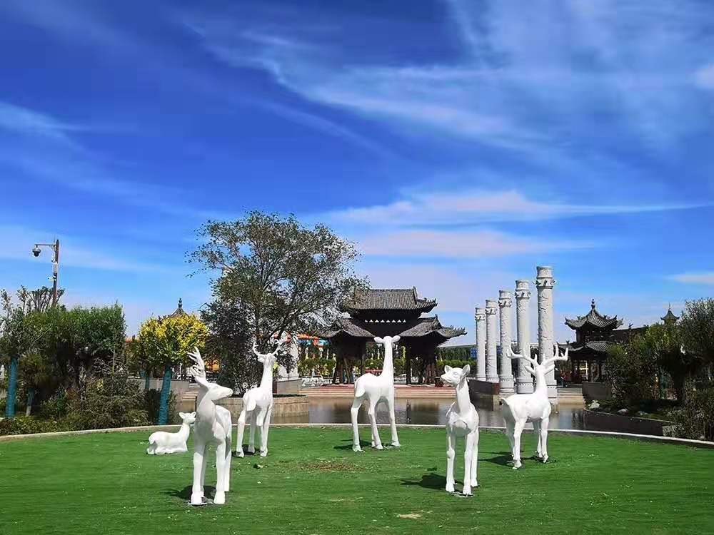 在白鹿仓峪泉古街入口,一座座白色的麋鹿雕像矗立其中,在蓝天的掩映之下,格外灵动。