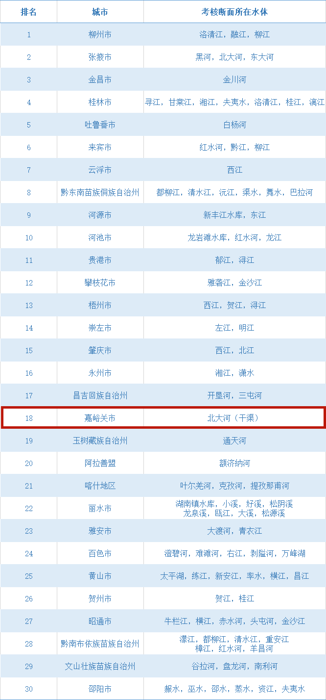 最新!2020年全国1-11月水质前30强公布,嘉峪关上榜!