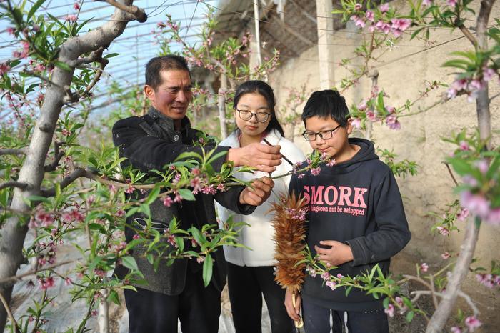 近日,文殊镇冯家沟村日光温室里的桃花竞相绽放,吸引市民游客前来观赏。图为孩子们利用周末时间走进日光温室,体验人工授粉。嘉峪关日报全媒体记者高深 通讯员马玉福摄影报道