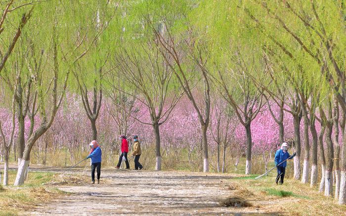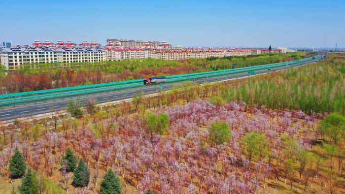 在嘉峪南桥东西两侧,平展展的黄绿色林带围拢着一片片粉紫樱桃花林,与蜿蜒曲折的林间小道谱写着一首幽静且舒适的田园诗歌。