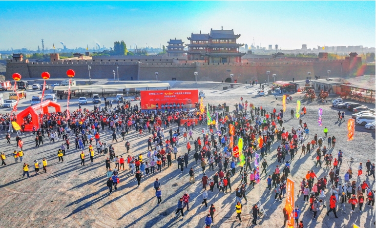城鸣笛开跑。近2000名徒步爱好者在和暖朝阳中开启健康、快乐的健步登