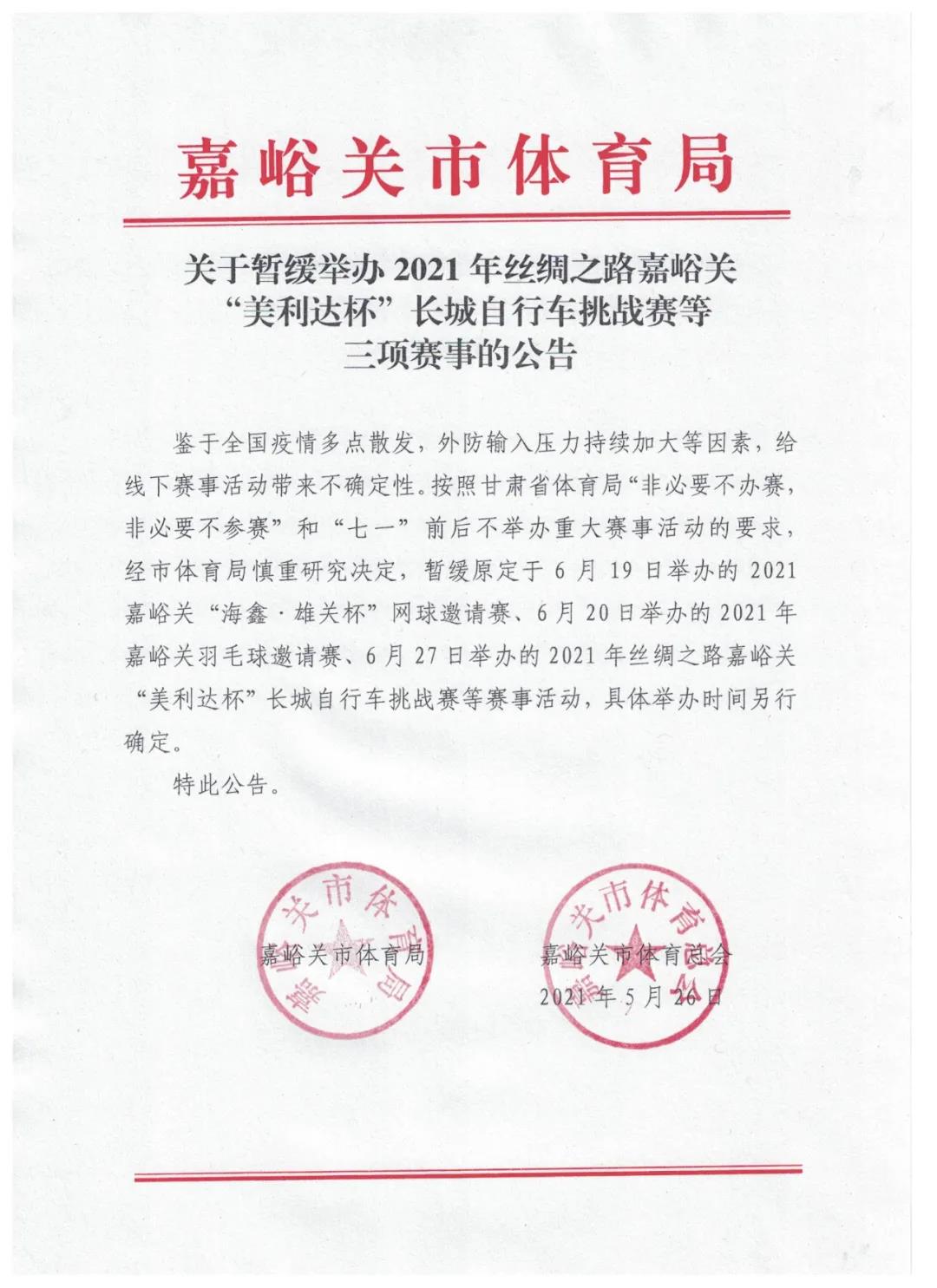 【公示公告】关于暂缓举办2021年丝绸之路嘉峪关 “美利达杯”长城自行车挑战赛等 三项赛事的公告