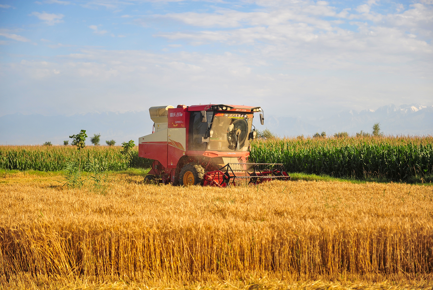 7月19日,新城镇小麦成熟,农机手驾驶联合收割机抢抓晴好天气收割小麦。