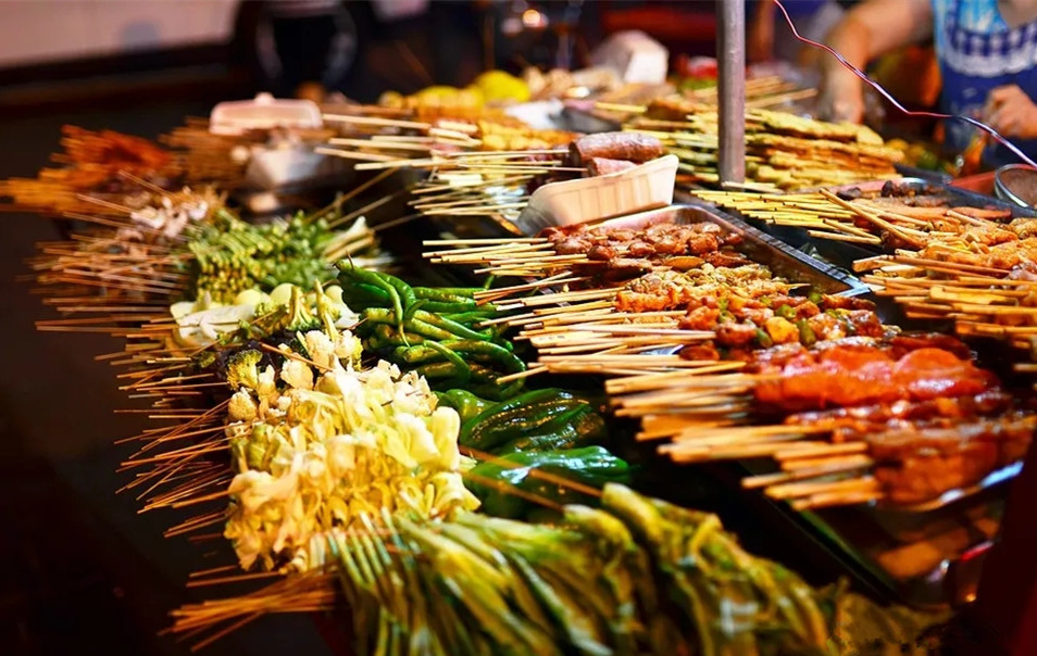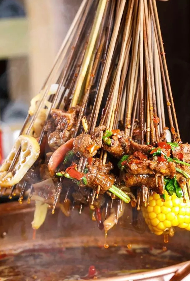 热气腾腾的一锅红汤以及那一大把的竹签,把荤的、素的往竹签上一穿,就构成了特别的一景。朋友家人三三两两围着小桌,轻松的环境,热闹的氛围,各拿一大把自己爱吃的串串煮进锅里,再加上冰镇啤酒,俨然一幅享受生活的景象。