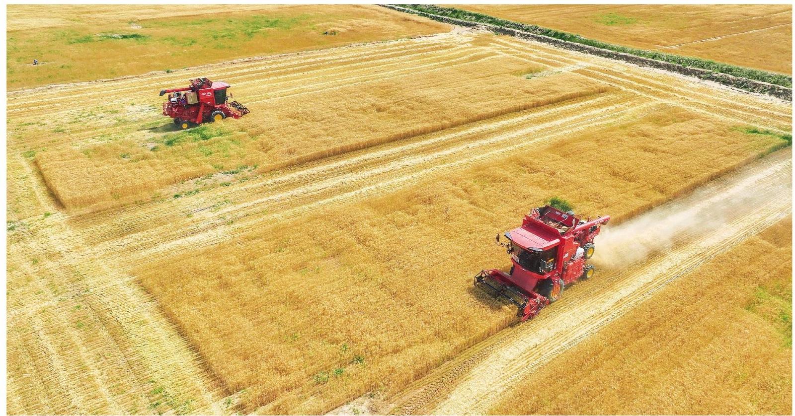 走进田间地头,入目金黄。一串串沉甸甸的麦穗随着微风摇摆出层叠浪花,与回荡其间的收割机轰鸣声相织,奏响丰收的欢快旋律。