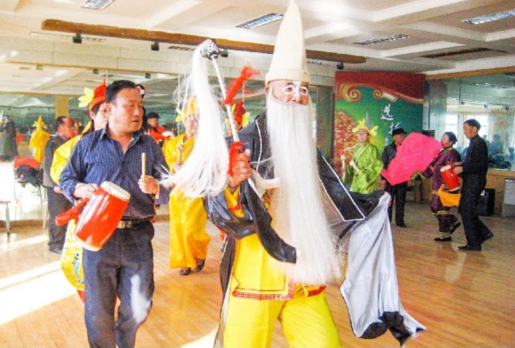 主要的道具有,腰鼓一个(两头各装一个小铁环,并用一条布带连接),鼓槌一个,棒槌两个,烟枪一个(一头是铜制的烟嘴,一头是铜制的斗,一个布制的小烟袋),一个小铜锣,一个锣棰,一把纸制花扇。