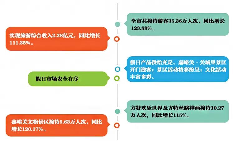 From May 1 to May 5, the city received 353600 tourists, an increase of 123.89% year-on-year, and the comprehensive tourism income reached 228million yuan, an increase of 111.35% year-on-year. Among them: 56300 people were received in Jiayuguan cultural relics scenic spot, an increase of 120.17% year-on-year, and 12700 reception times of Fanta Wild Adventure and Fanta Road God paintings, an increase of 115% year-on-year. The average room rental rate of 15 key monitoring units was 64.3% higher than that of the previous year by 36.6%. The total number of rural tourism reception is 48000.