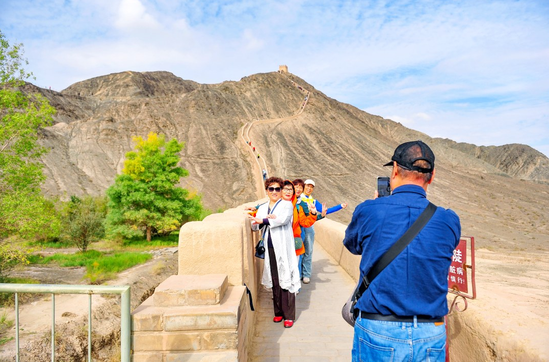 During the Mid-Autumn Festival holiday, Jiayuguan's scenic sites experienced peak visitor numbers. Travelers from across China ascended the Great Wall, marveling at its majestic grandeur while immersing themselves in the profound cultural heritage of this ancient wonder.