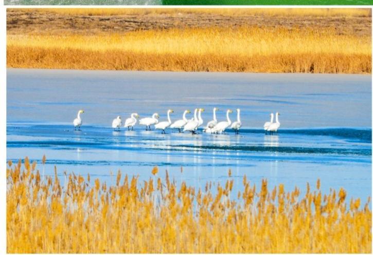 Recently, Jiayuguan Caohu National Wetland Park has welcomed dozens of overwintering swans. They either spread their wings andar over the clear lake surface, or play and swim, or preen their feathers. Their agile figures and the wetland scenery complement each other, forming a charming ecological picture of. This is on November 29, overwintering swans swim on ...