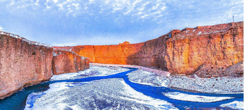 On December 22nd, the majestic Dahong Canyon of the Tao Le River, with its snowy backdrop, exuded a tranquil. Standing atop the canyon's towering cliffs, the first watchtower of the Great Wall at Jiayuguan, quietly "enjoyed" the after-snow sun.