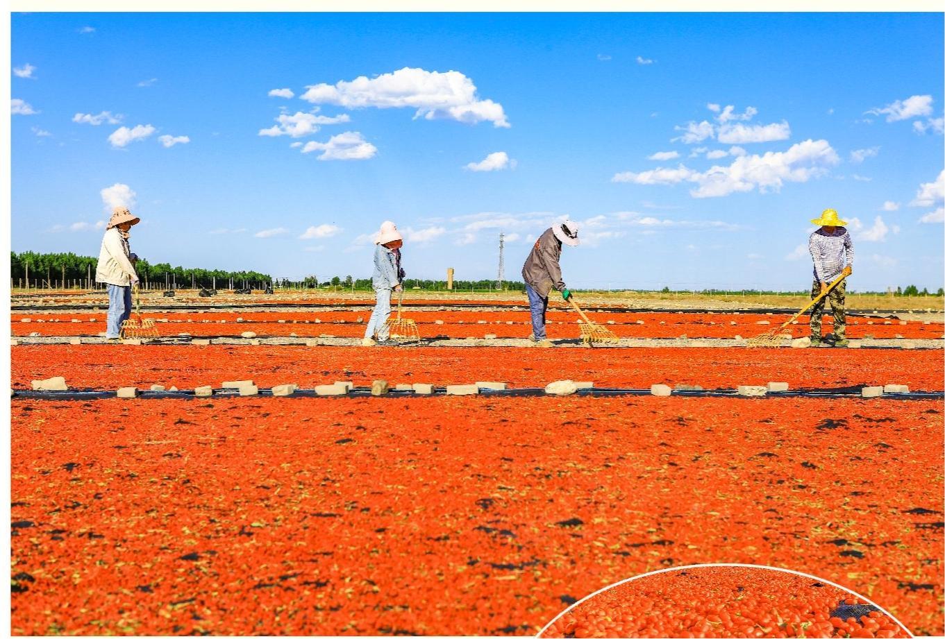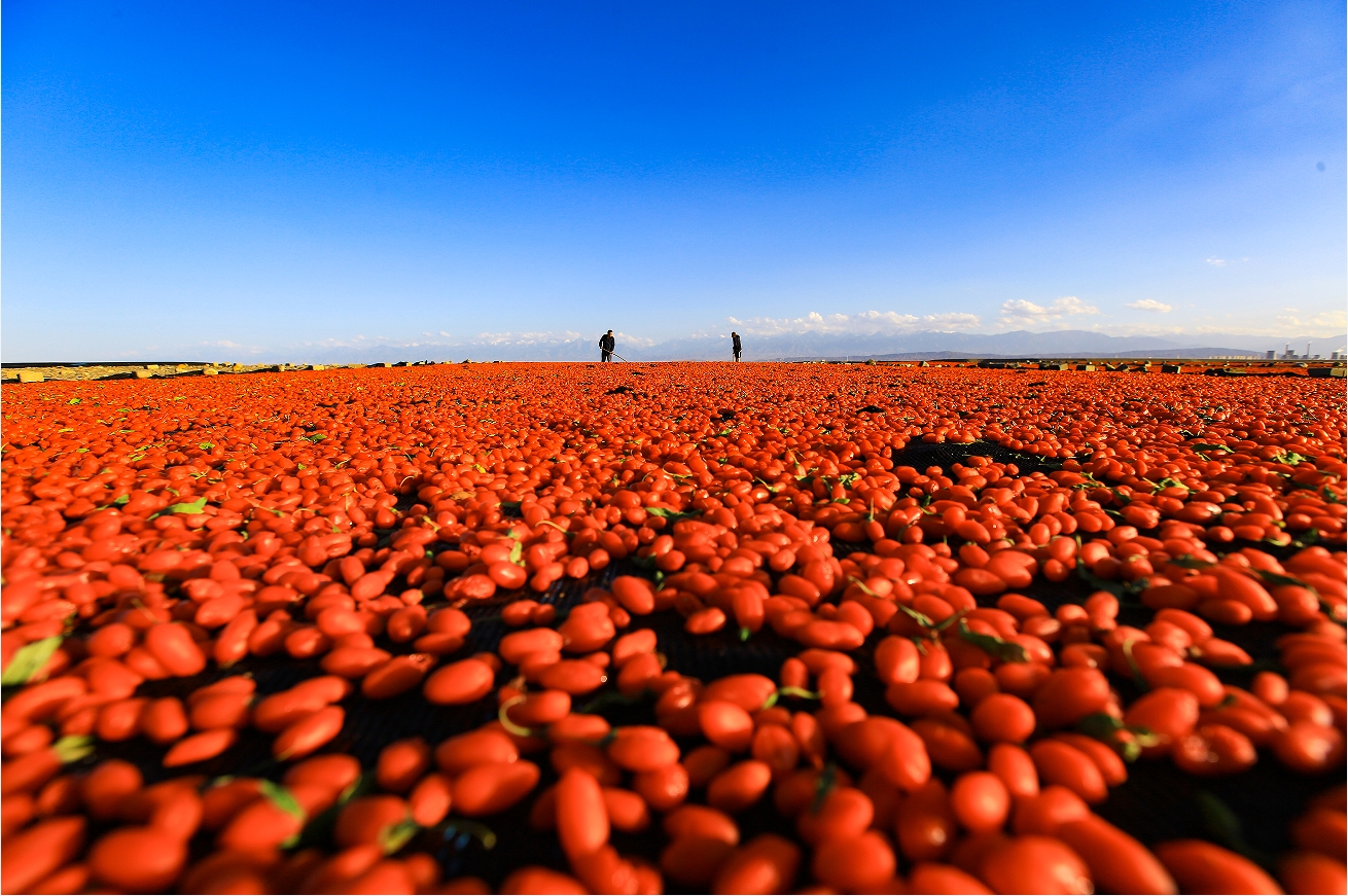 On June 26th, the first crop of Wolfberry from Hongyuan Company in Jiayuguan City, covering an area of .89 million mu, was harvested with a bumper yield. Farmers took advantage of the fine weather to pick and dry the berries, creating a vivid scene of harvest in the fields on the Gobi drying grounds.