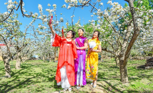 Recently, the town of Wenshu pear blossoms in full bloom, attracting many tourists to come to the green flowers, feel the spring good time. This is April 23, tourists dressed in colorful costumes, in the pear garden to enjoy the pear blossoms. Reporter Li Wei photo