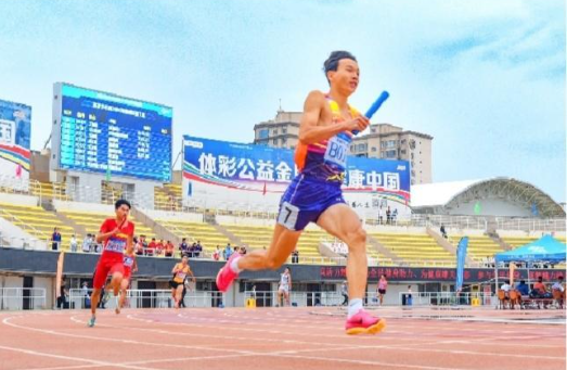 The picture shows that Jiayuguan team fought hard and won the laurels in the final of 4×400 meters relay race of mixed junior group.