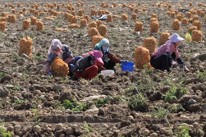 Recently, in the 500 mu Plateau Summer Vegetable planting base in Xincheng village, Xincheng Town, growers are busy sorting, bagging and transporting early maturing potatoes. The field presents a busy harvest scene.