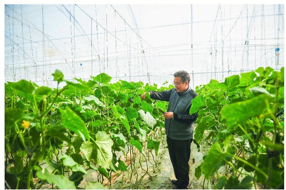 At present, the high-quality cucumbers in the greenhouse of Xincheng Town, Yeshewan Village, are ripe and on the market, and the are busy picking and managing the crops. This is a visitor picking cucumbers on April 5th.