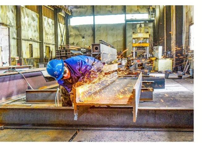 Large gantry cranes lift steel structure raw materials to the next production link. Skilled workers who are already familiar with the operation process cut the raw materials into steel plates according to the design drawings with plasma CNC cutting machines, and then start assembling and welding, in one go.